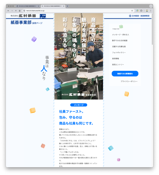北村紙器様のリクルートサイトを制作いたしました。紙器事業…